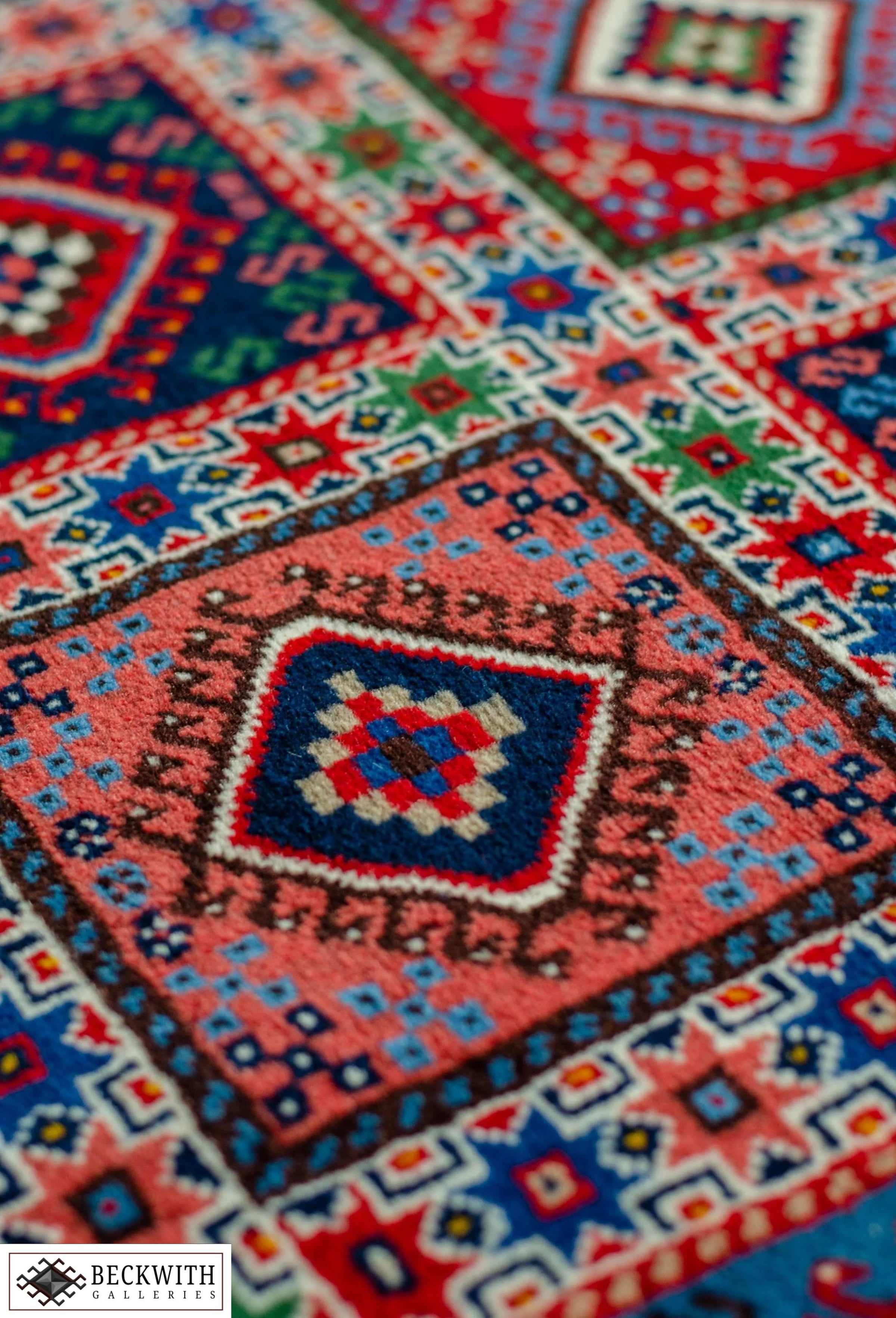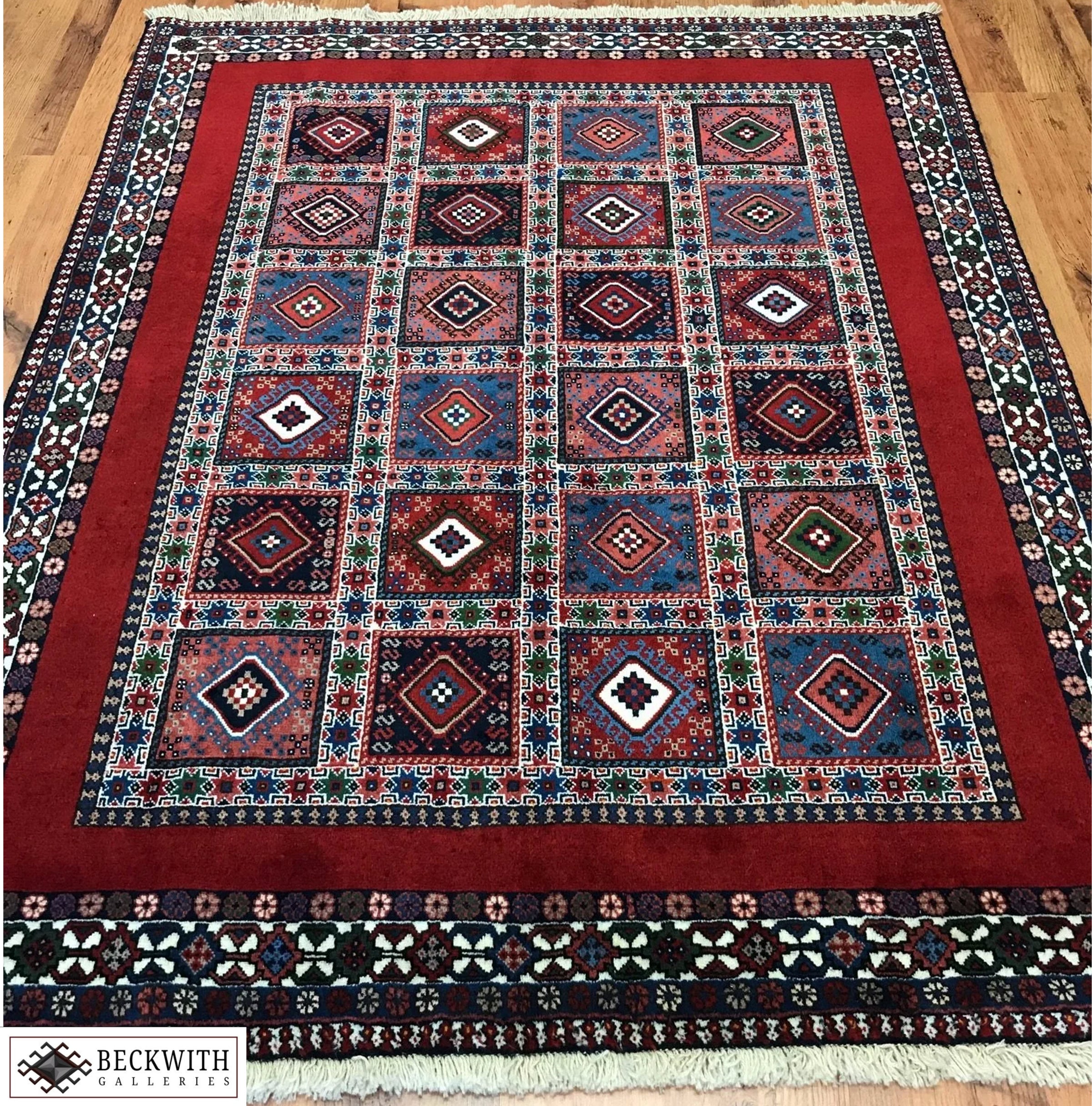 Hand-Knotted Yalameh Persian rug featuring an allover geometric design in colourful tones.  Made with a wool pile on a cotton base. This rare Persian rug is an excellent choice for high traffic areas. Features a warm, medium pile.